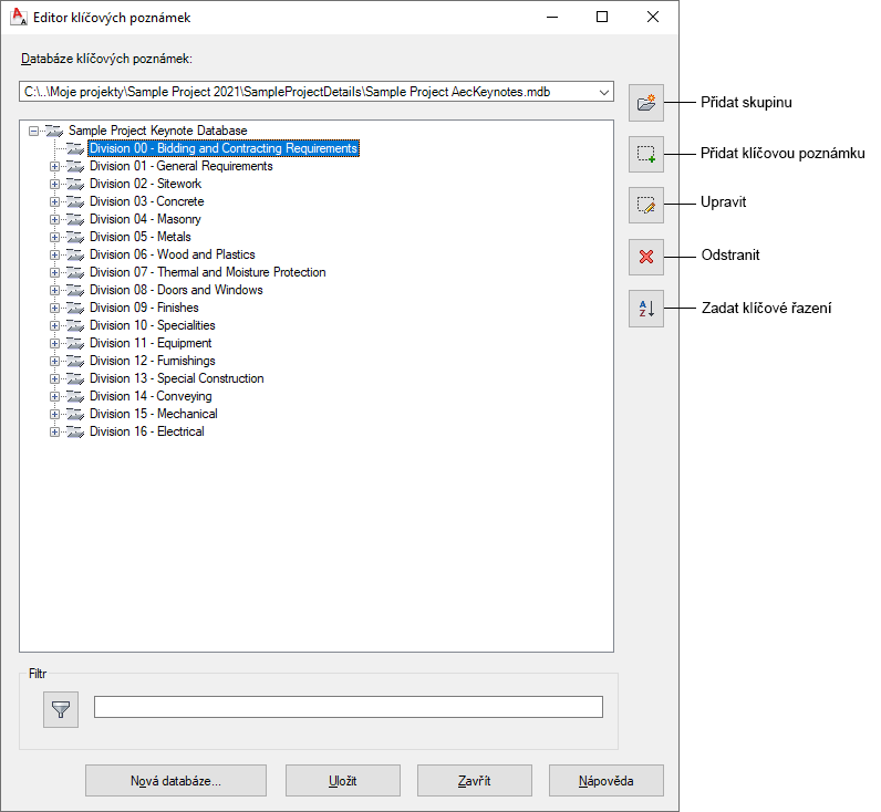 Editor klíčových poznámek je samostatná aplikace, která umožňuje vytvořit a změnit databáze klíčových poznámek. Je-li dialog Editor klíčových poznámek otevřen z nabídky Správce CAD, umožňuje hierarchické stromové prohlížení aktuálně vybrané databáze, která je zobrazena jako kořenový uzel. Pro existující databáze můžete rozbalit kořenový uzel, aby se zobrazily skupiny, a poté můžete rozšířit uzly skupin, aby se zobrazily podskupiny nebo jednotlivé klíčové poznámky. Případně můžete zadat text do pole Filtr, které se nachází pod stromovým zobrazením. Kliknutím na tlačítko Filtr, stisknutím klávesy Tab nebo stisknutím klávesy Enter rozbalíte všechny uzly pod libovolným uzlem, jehož název zahrnuje zadaný text.