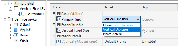 Poté, co definujete dělení, můžete je přiřadit k primární osnově nebo k vnořeným osnovám. Vložené osnovy se vytvoří jako přiřazení buňky pomocí volby Vložená osnova.