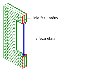 Jestliže například rozříznete cihlovou stěnu, která obsahuje okno, můžete zadat jednu homogenní barvu pro definující čáru nebo použít jiné barvy tam, kde čára řezu řeže stěnu a tam, kde řeže okno. Jestliže chcete použít homogenní barvu pro komponentu Definující čára, přiřaďte jí barvu a nepoužijte vlastnosti materiálu. Jestliže chcete, aby byla barva definující čáry ovlivněna objekty v řezu, použijte vlastnosti materiálu. V případě řezu cihlovou stěnou s oknem byste mohli použít červenou definující čáru tam, kde je rozříznuta stěna a modrou definující čáru tam, kde je rozříznuto okno.