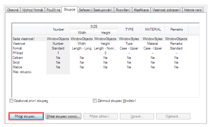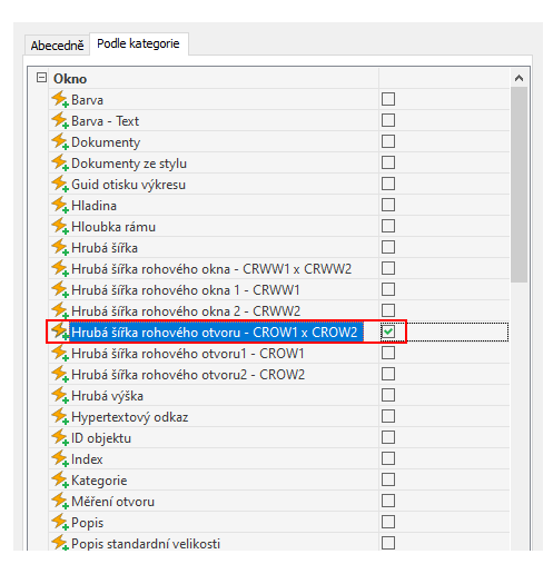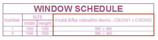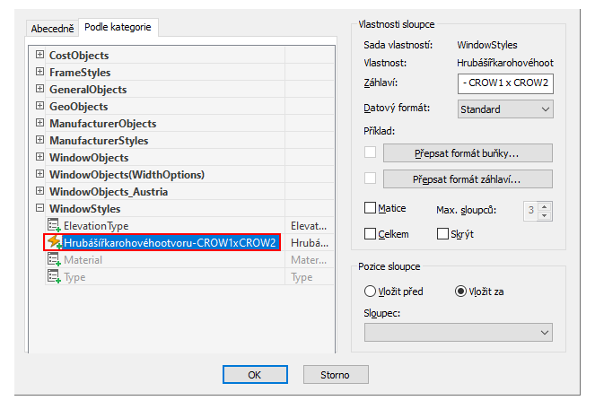 V dialogu Přidat sloupec pod položkou Styly oken vyberte položku Hrubá šířka rohového otvoru – CROW1 X CROW2.