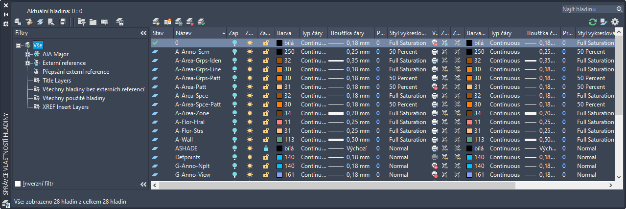 Tento postup použijte k otevření Správce vlastností hladin. Po otevření Správce vlastností hladin se všechny hladiny v aktuálním výkresu zobrazí v pravém podokně, zatímco skupiny hladin se zobrazí v levém podokně.