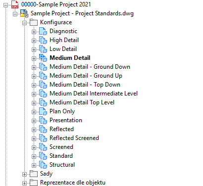 Standardní nastavení zobrazení jsou zobrazena ve Správci zobrazení. Existuje zde určitý počet různých ikon proto aby je odlišili, což záleží na jejich stavu s ohledem na projektové normy.