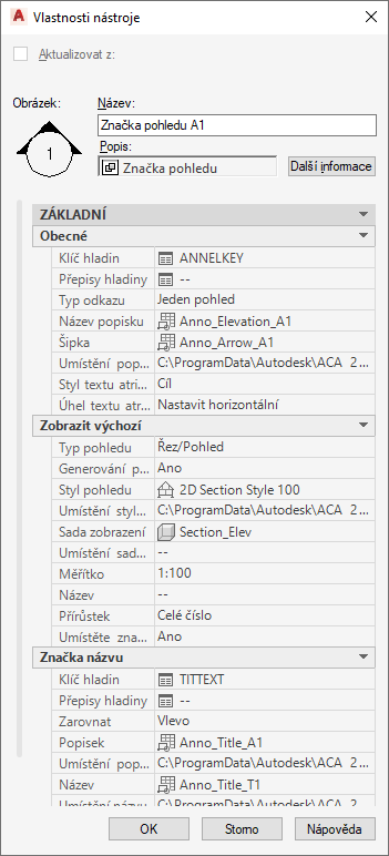 Specifický druh poznámky, její vzhled a další charakteristiky jsou určeny uživatelsky upravovatelnými hodnotami v tabulce Vlastnosti nástroje, která je dostupná v kontextové nabídce daného nástroje.