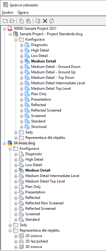 Standardní styly a nastavení zobrazení jsou zobrazeny ve Správci stylů a Správci zobrazení. V závislosti na jejich stavu pokud jde o projektové normy je zde obsaženo množství různých ikon pro jejich rozlišení.