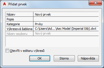 | pojmenovat nový prvek | zadejte název. Pokud se číslo projektu použije jako předpona názvů souborů projektu, není nutné zde předponu zadávat. Úplný název s předponou se zobrazuje pod možností Název souboru. |