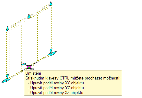 V pohledu Model má uzel Umístění tři možné režimy úprav: Upravit podél roviny objektu XY, Upravit podél roviny objektu YZ a Upravit podél roviny objektu XZ. Stisknutím klávesy Ctrl cyklicky procházejte tyto režimy, dokud nenastavíte požadovaný režim. Výchozí režim úprav je podél roviny XY. V Půdorysu je pohyb Uzlu umístění omezen na jednu rovinu.
