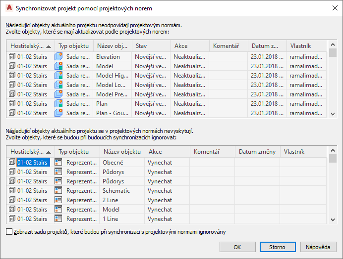 V dialogu synchronizace se zobrazují dva seznamy. Horní seznam obsahuje styly a nastavení zobrazení, která jsou buď staršími verzemi stylů norem nebo nastavení zobrazení, nebo nestandardními (novějšími) verzemi. Spodní seznam obsahuje soupis nejednotných stylů a nastavení zobrazení. Definice termínů najdete v tématu O terminologii projektových norem.