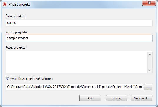 Poznámka: Přímo při vytváření nového projektu nelze zadat všechny podpůrné soubory a cesty. Definovat lze pouze název, číslo, popis a šablonu projektu. Zbývající nastavení lze definovat až po vytvoření projektu. Pokud projekt vytváříte na základě šablony, bude nastavení šablony použito pro počáteční nastavení.