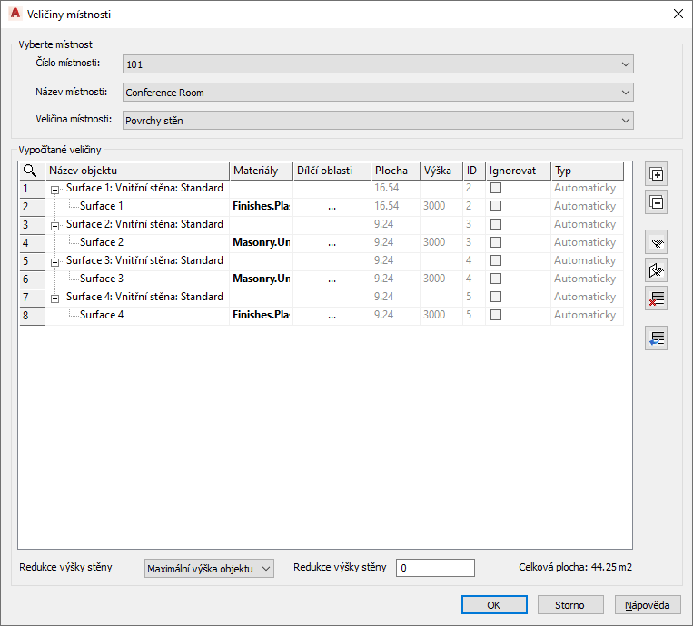 - Vybere vypočtenou veličinu místnosti: povrchy stěn, podlah, stropů, obvody místnosti a objekty nábytku. Vypočtené objekty a hodnoty jsou uvedeny v tabulce v závislosti na vybrané veličině místnosti. Veličiny místnosti jsou vypsány samostatně pro každou místnost (prostor).