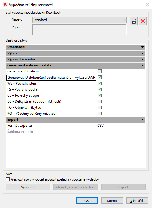 - V dialogu Vypočítat veličiny místnosti vyberte v části Vlastnosti stylu v seznamu Generovat data výkresu možnost Generovat ID konečné úpravy podle materiálu.