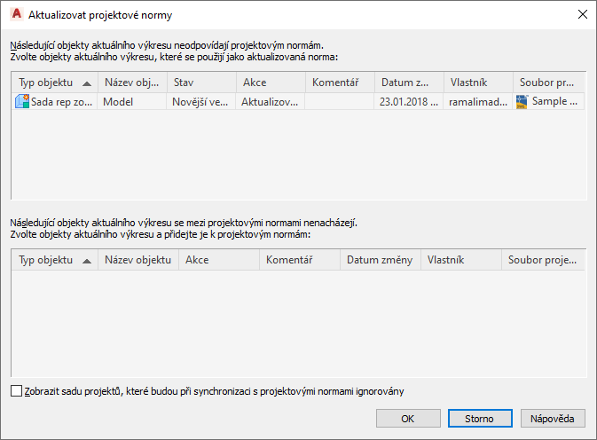 V takovém případě nebude položka v příštích aktualizacích zobrazena s výjimkou případů, kdy vyberete možnost zobrazení sady objektů, které mají být při synchronizaci s projektovými standardy ignorovány, nebo odeberete z nastavení zobrazení ve Správci zobrazení příznak Ignorovat.
