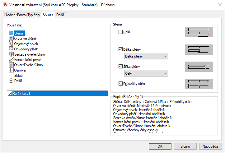 Příklad: V prvním řetězci chcete okótovat délky a průsečíky stěn. V části Použít na proto vyberte položku Stěna.