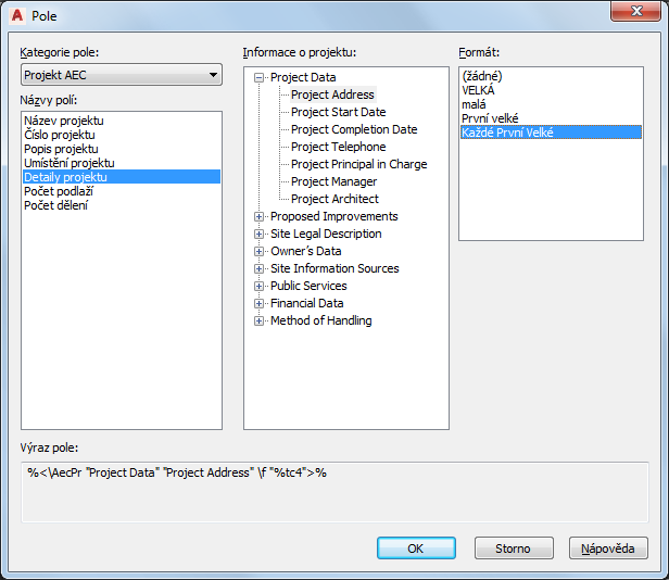 Pokud například chcete zobrazit detaily projektu, vyberte položku Projekt AEC pro kategorii Pole a poté Detaily projektu pro Název pole.