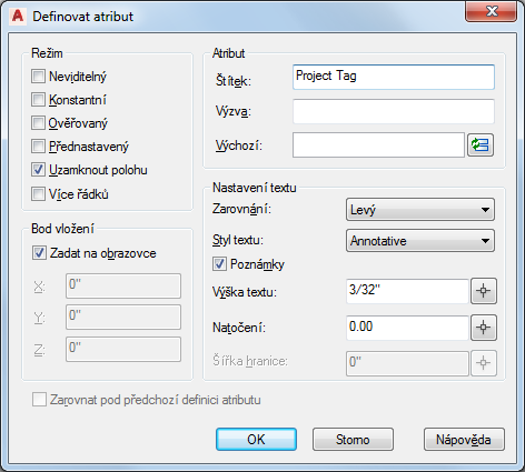 Tento postup slouží k přidání atributů projektu pro blok nadpisů do výkresu.