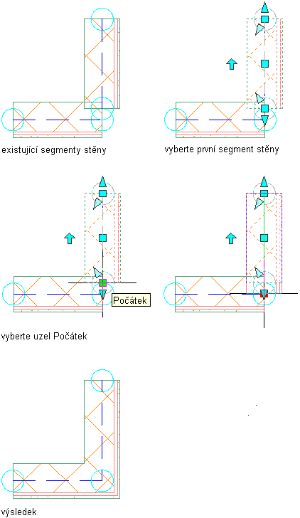 Zarovnávací čáry segmentů stěn se vzájemně neprotínají nebo jedna ze zarovnávacích čar nespadá do přilehlé kružnice začištění. Upravte délku jednoho segmentu stěny tak, aby konec její zarovnávací čáry spadal do kružnice začištění přilehlého segmentu stěny.