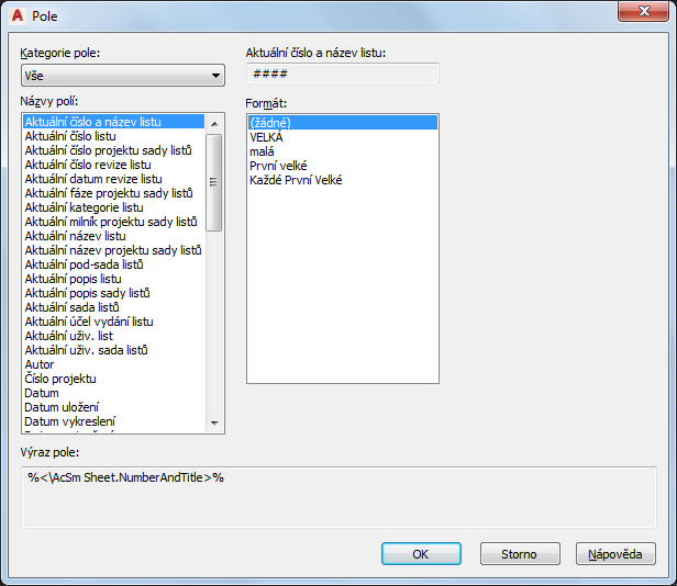 | datum/čas, dokument, hypertextový odkaz, objekt, systémovou proměnnou, výraz DIESEL nebo pole vykreslování | viz téma Použití polí v textu v Nápovědě k aplikaci AutoCAD. |