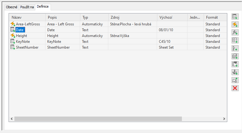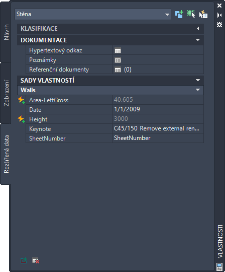 Vlastnosti stěny s poli klíčové poznámky, data a sady listů