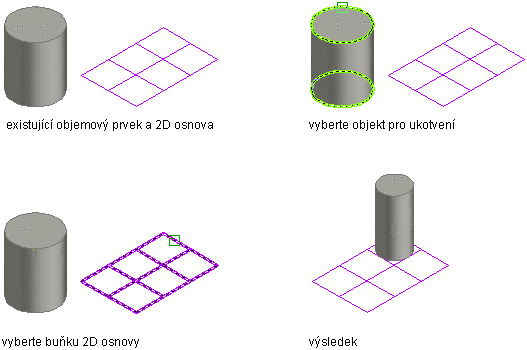 Poznámka: Není žádná pravidlo určující, ke které buňce bude objekt připevněn při jeho ukotvení. Chcete-li usnadnit výběr buňky, můžete zapnout komponentu zobrazení uzlu, tím zobrazíte buňkové uzly osnovy rozvržení či objemové osnovy. Objekt můžete přesunout i poté, co jej ukotvíte k osnově rozvržení či objemové osnově.