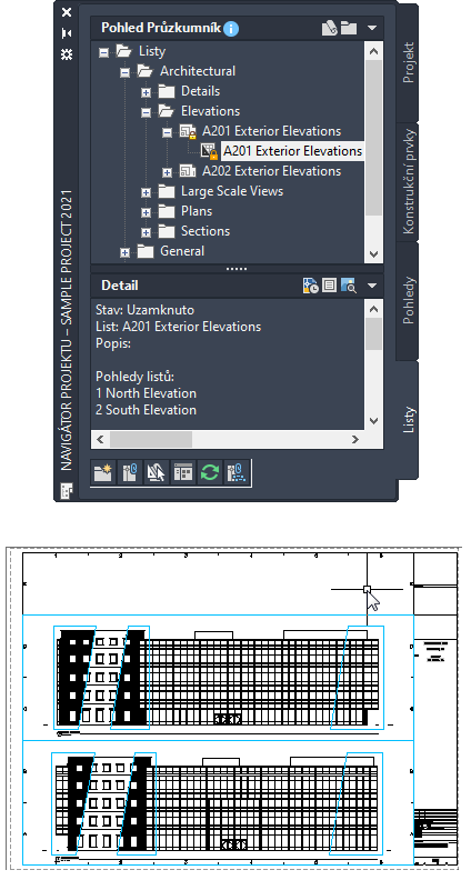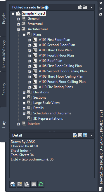 Sada listů, listy, pohledy listů, výkresy listů a pohledy modelového prostoru jsou uvedeny na kartě Listy a pohledy v Navigátoru projektu.