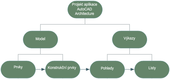 Projekt aplikace Sada nástrojů AutoCAD Architecture 2027 má základní strukturu ve formátu XML. Pro každý vytvářený výkresový soubor, například výkres podlahy nebo konstrukční výkres, je vytvořen doprovodný soubor ve formátu XML. Tento soubor XML obsahuje informace vztahující se k projektu, například informace o hladině a dělení. Jakýkoli výkresový soubor vytvořený v rámci projektu můžete také znovu použít mimo projekt, protože vlastní výkresový soubor neobsahuje informace vztahující se k projektu.