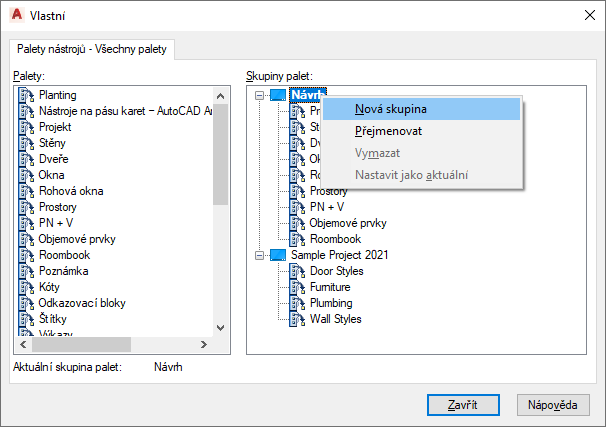Tento postup slouží k vytvoření nové skupiny palet nástrojů.