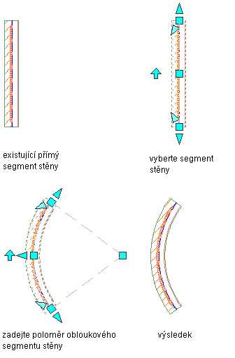 Když se mění zakřivená stěna na přímou stěnu, vytvoří software přímý segment mezi počátečním a koncovým bodem křivky. Délku a umístění stěny lze upravit pomocí uzlů.