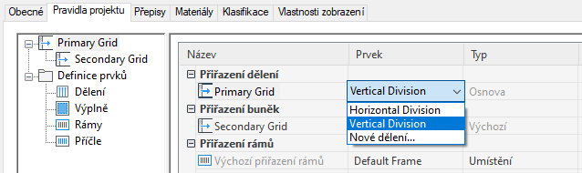 Tento postup použijte pro přiřazení dělení k osnově jednotky obvodového pláště. Dělení definuje orientaci osnovy (zda je směr příčlí a buněk osnovy vodorovný nebo svislý) a typ dělení (počet a velikost buněk).