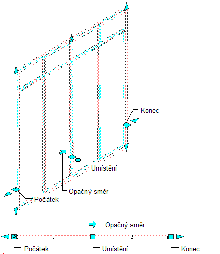 Zobrazení uzlů počátku, konce, umístění a obrácení směru jednotky obvodového pláště