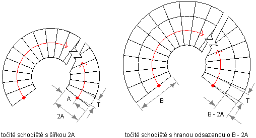 K vytvoření spirálového schodiště se zadanou hloubkou stupně (T), která se objeví v zadané vzdálenosti od vnitřní hrany, vytvořte nejdříve schodiště se šířkou rovnou dvojnásobku požadované vzdálenosti (A). Dále použijte Přizpůsobené hrany na odsazení vnější hrany na požadovanou celkovou šířku B. Vzdálenost odsazení je rovna B-2A.