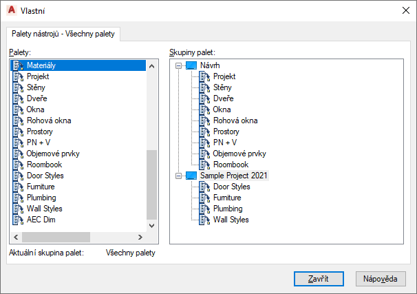 . - Jestliže skupina palet nástrojů projektu obsahuje nejméně jednu paletu, zobrazí se na seznamu dostupných skupin palet nástrojů a může být vybrána.