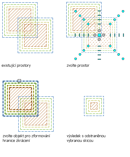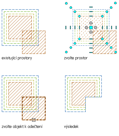 Chcete-li vytvořit otvor, je nutné vybrat prostory, které se vzájemně protínají. Případně můžete vybrat uzavřenou křivku jako tvar k odečtení. Můžete zvolit, zda má být odečítaný prostor nebo křivka zachován ve výkresu jako samostatná jednotka. Tento prostor je vhodné zachovat, pokud například potřebujete odečíst stejný tvar od jiných prostorů.