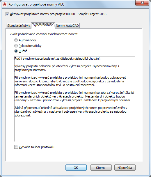 Poznámka: Nastavení synchronizace, které jste definovali, je platné pouze pro synchronizaci standardních stylů AEC a nastavení zobrazení v projektu. Neovlivní synchronizaci norem aplikace AutoCAD v projektu. Nastavení v tomto dialogovém okně řídí pouze synchronizaci projektových výkresů s výkresy projektových norem. Nespecifikují, jak jsou výkresy projektových norem synchronizovány mezi sebou.