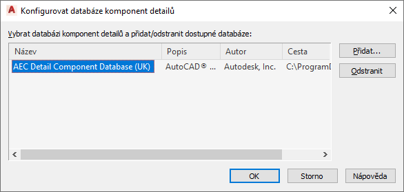 - Na stránce Obsah AEC zobrazte kliknutím na tlačítko Přidat/Odebrat databáze komponent detailů.