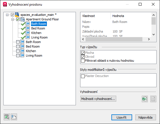 - Vyberte prostory a zóny, které chcete zahrnout do vyhodnocení půdorysu zaškrtnutím příslušných políček.