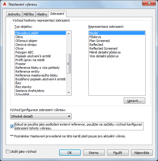 Zadání výchozích možností zobrazení u aktuálního výkresu