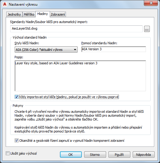Ve výchozím nastavení je soubor AecLayerStd.dwg (umístěný ve výše zmiňované složce Layers) načten automaticky. Tento soubor obsahuje standardy hladin a styly klíčů hladin.