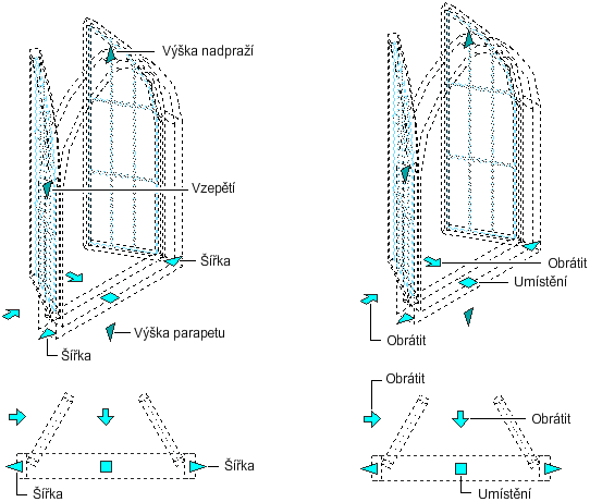 Umožňuje změnu výšky okna. Je možné zvolit, zda změnit výšku parapetu nebo výšku nadpraží. |