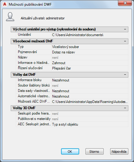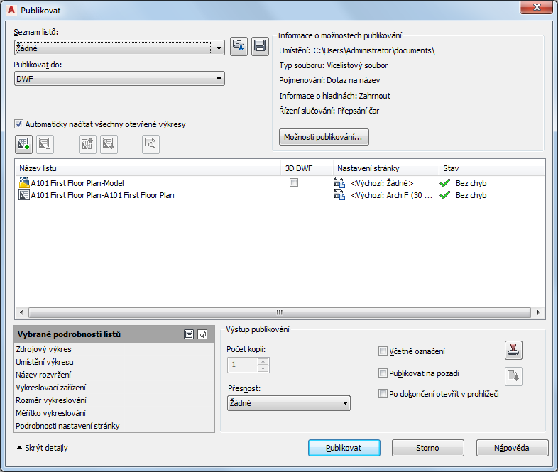 Máte možnost nastavit automatické publikování výkresů do formátu PDF (nebo DWF či DWFx) při každém jejich uložení nebo zavření. U nastavení automatického publikování lze také určit, zda mají být zahrnuty modely, rozvržení nebo obě tyto možnosti a zda mají být publikovány soubory s více listy nebo soubory s jediným listem.