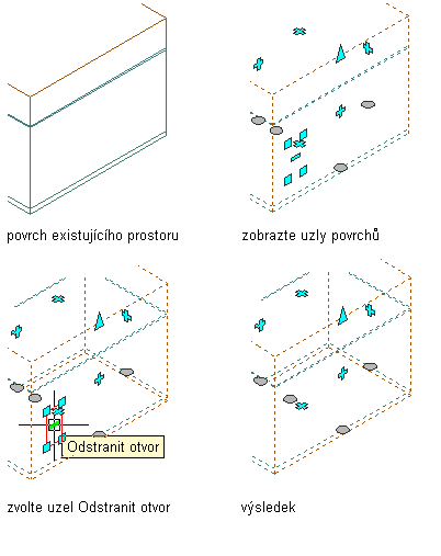Tento postup slouží k odebrání otvorů z povrchů vysunutého 3D prostoru a 3D prostoru volného tvaru.