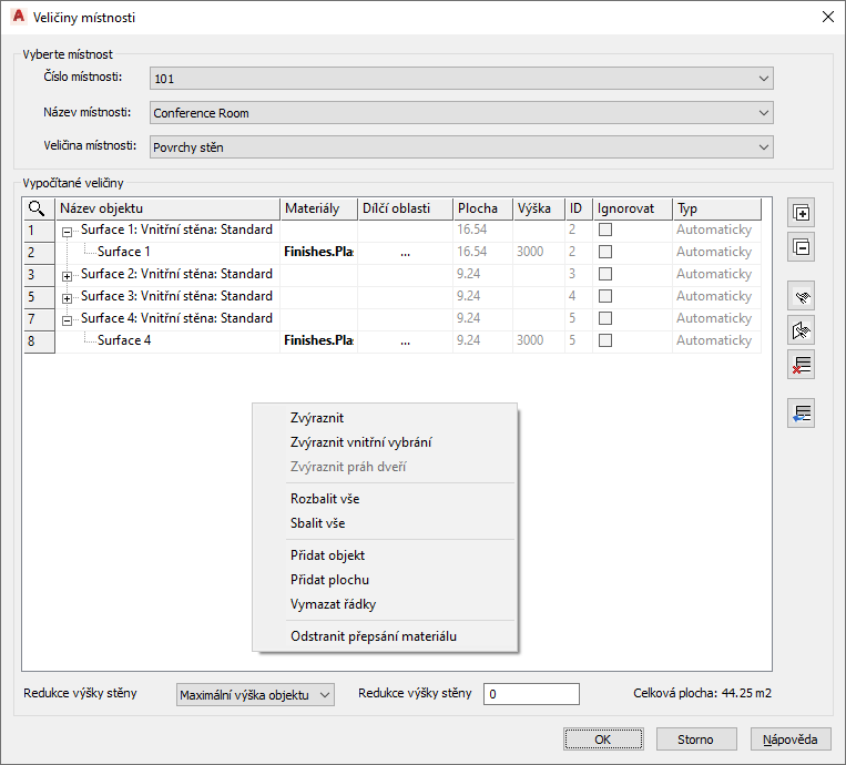 zobrazte všechny související dílčí oblasti: - Dílčí oblasti (okna, dveře, otvory atd.) patřící k vypočtenému povrchu: název, materiál, rozměry atd.
