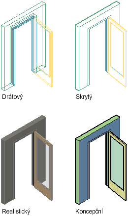 Dveře v reprezentacích zobrazovacích stylů Drátový model, Skrytý, Realistický a Koncepční