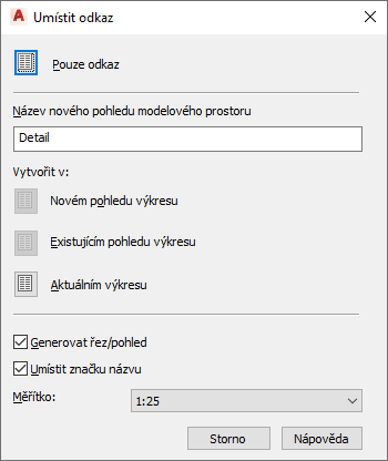 | umístit odkaz na detail | vložte nástroj podle popisu uvedeného v tématu Vytvoření detailu v aktuálním pohledu výkresu. |