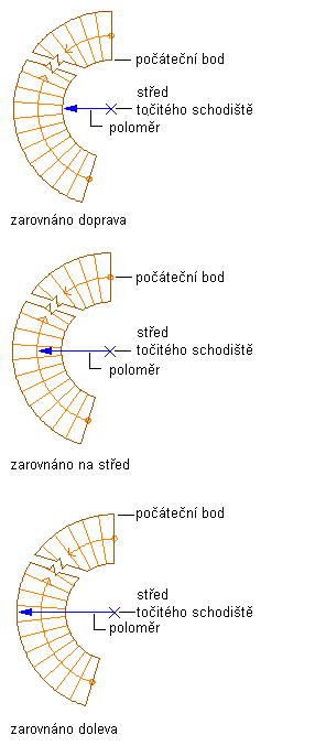 Tento poloměr se měří od středu spirálového schodiště k vybranému bodu zarovnání.