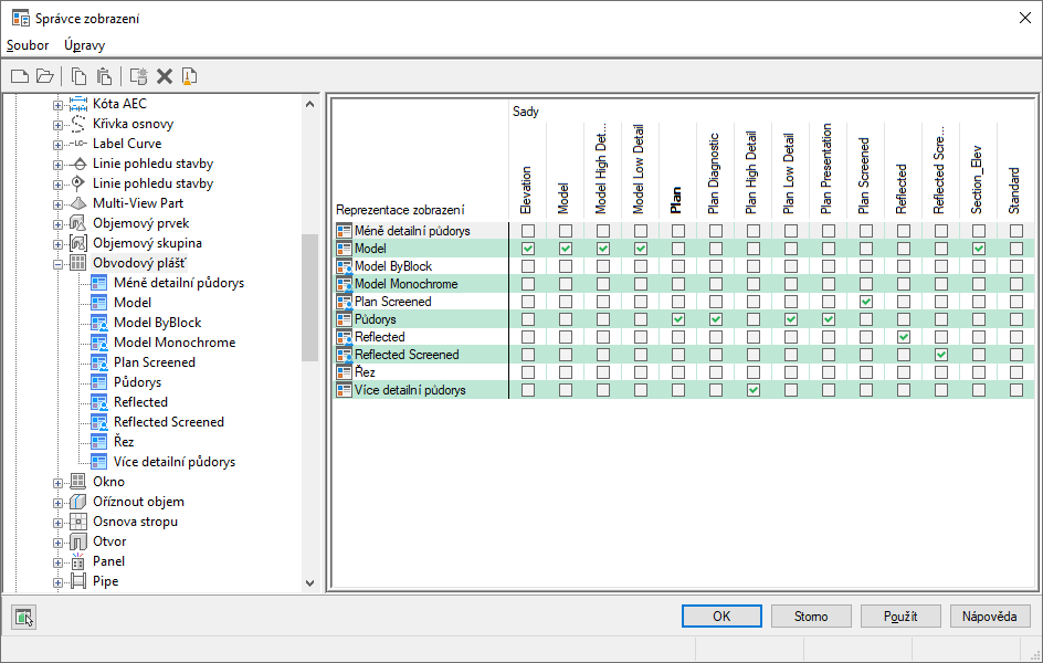 . Reprezentace zobrazení mohou mít různé ikony v závislosti na funkci ve výkresu.