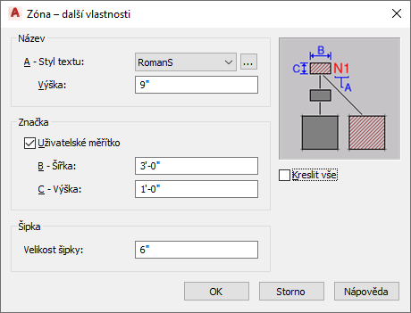 Tento postup slouží k zadání stylu textu, velikosti označení zóny a šipky čáry připojení u vybrané zóny. Můžete také určit, zda bude šrafování zóny použito pouze u přímo připojených prostorů nebo pro ty, které jsou připojeny také pomocí dílčích zón.