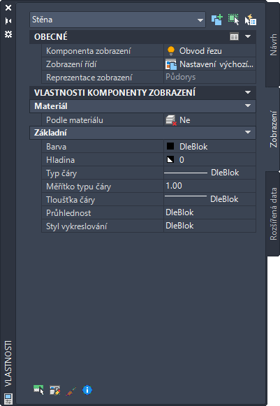 Stejně jako karta Projekt na paletě Vlastnosti umožňuje kontrolu fyzických vlastností objektu nabízí karta Zobrazení možnost kontroly grafických vlastností objektu úpravou nastavení jeho jednotlivých součástí zobrazení, jako jsou hranice a šrafování. Změny provedené na této kartě jsou ihned viditelné v aktuálně platném vyjádření zobrazení, jako je Půdorys nebo Model, a uživatel má možnost použít ve vyjádření zobrazení použít vlastní změny. Také platí, že i když se nastavení na kartě Projekt vztahuje pouze k aktuálně vybraným objektům, můžete určit, zda se změna provedená ve vlastnosti na kartě Zobrazení bude vztahovat k vybrané součásti všech objektů daného typu, všech objektů daného stylu nebo pouze vybraného objektu. Je-li komponenta zobrazení určována podle materiálu, budou se změny vztahovat ke všech objektům používajícím daný materiál.