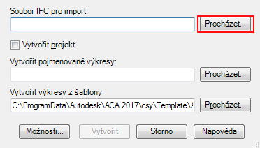 - V dialogu Importovat soubor IFC a vytvořit výkres klikněte na tlačítko Procházet v části Soubor IFC pro import.