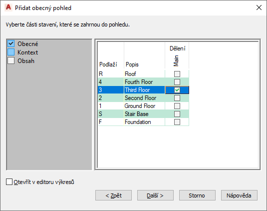 Tento postup slouží k výběru částí budovy, které se mají zahrnout do pohledu při přiřazování hladin a dělení. Pro výkres pohledu můžete vybrat více hladin a dělení, například k vytvoření pohledu na celou budovu. Tím se poskytuje kontext pro výkres pohledu.