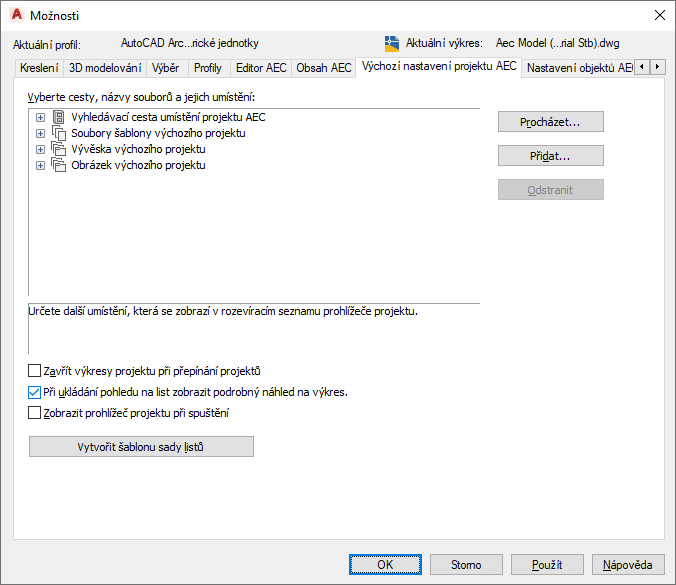 | Pohled modelu | Umístění výkresů pohledů modelu nejsou v sadách listů aplikace Sada nástrojů AutoCAD Architecture 2027 sledována. Jsou automaticky převzata z pohledů projektu. V sadě listů aplikace AutoCAD toto pole zobrazuje cesty a názvy složek obsahujících výkresy používané sadou listů. |