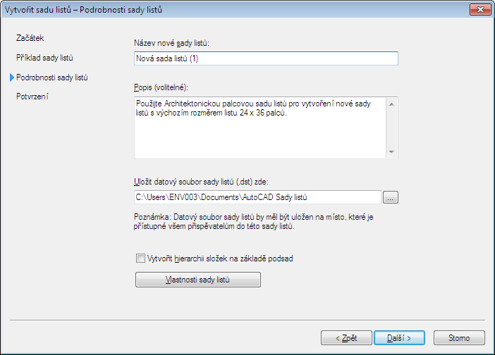 Pokud vytváříte šablonu sady listů pro projekt aplikace Sada nástrojů AutoCAD Architecture 2027, výběr možnosti Vytvořit hierarchii složek na základě podsad nebude mít žádný vliv, protože k dílčím sadám listů v Prohlížeči výkresů budou automaticky přiřazeny odpovídající složky. Jestliže vytváříte šablonu sady listů pro sadu listů aplikace AutoCAD, můžete vybrat tuto možnost. Tím se v sadě listů vytvoří nová dílčí složka pokaždé, když ve Správci sad listů vytvoříte novou dílčí sadu listů.
